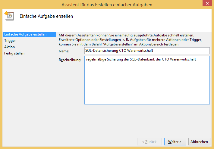 Mit der Windows Aufgabenplanung können Sie eine neue Aufgabe anlegen, die eine Sicherung Ihrer SQL-Datenbank mithilfe der Batch-Datei (siehe Kapitel 2) automatisch und regelmäßig ausführt.