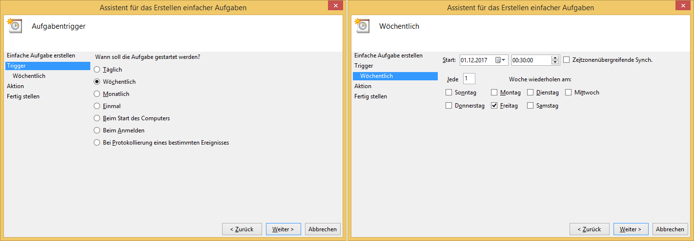 Wählen Sie nun einen Zeitpunkt für die Durchführung der regelmäßigen Sicherung aus. Sie können z.B. täglich oder wöchentlich die automatische Sicherung ausführen. Wählen Sie im besten Fall einen Zeitpunkt aus, zu dem der PC gestartet ist, aber nur wenige oder keine Zugriffe zur Datenbank erfolgen. In dem Beispiel wurde eine wöchentliche Sicherung gewählt, die immer freitags um 00:30 Uhr ausgeführt wird (vgl. Abbildung 3). Bestätigen Sie Ihre Eingaben mit Weiter.