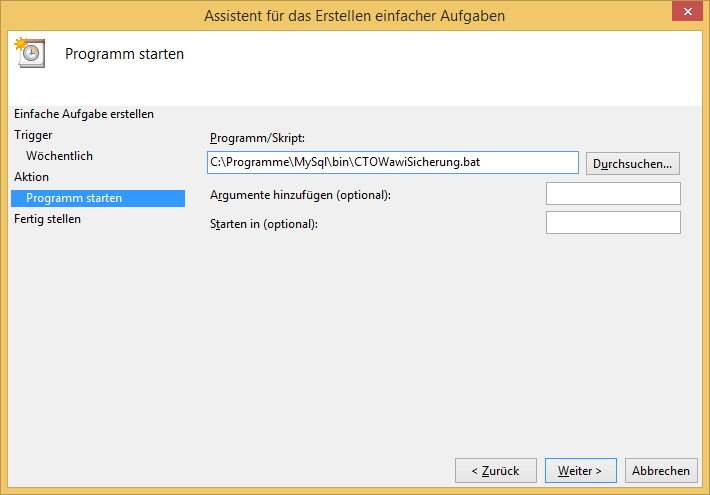 Beispiel: C:\Programme\MySql\bin\CTOWawiSicherung.bat