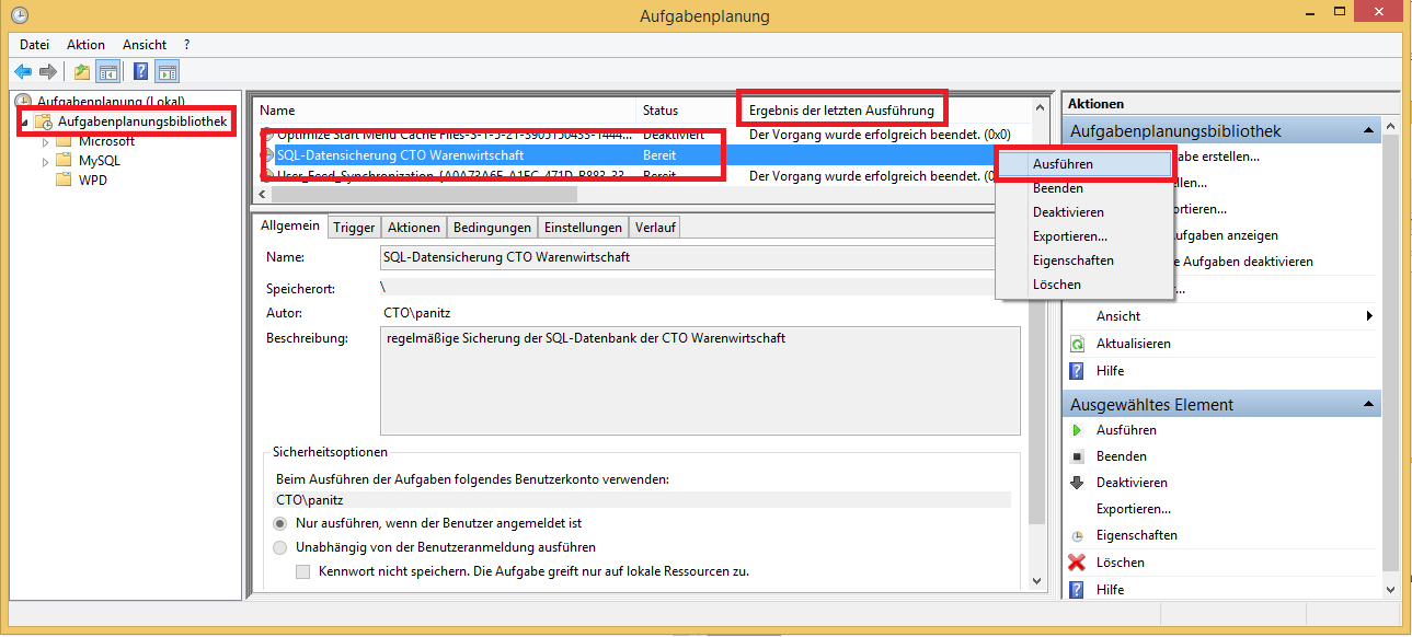 Bitte führen Sie die in Kapitel 3.1 angelegte Aufgabe einmal manuell aus, um diese zu testen. Wechseln Sie dafür in der Windows Aufgabenplanung in die Aufgabenplanungsbibliothek. Hier markieren Sie die Aufgabe SQL-Datensicherung CTO Warenwirtschaft und rufen per Rechtsklick das Kontextmenü auf. Um die Aufgabe manuell zu testen, wählen Sie die Option Ausführen (vgl. Abbildung 5). Sie können das Ergebnis des Tests in der Spalte Ergebnis der letzten Ausführung überprüfen. In dem von Ihnen angegebenen Zeilverzeichnis sollte eine neue SQL-Datei befinden.