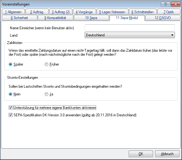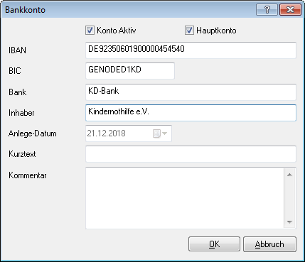Falls Sie das die Warenwirtschaft Business mit dem Sepa-Modul einsetzen und die Unterstützung für mehrere eigene Bankkonten aktiviert haben, wird auf das Konto zugegriffen, welches Sie unter Menü – Allgemein – Bankkonten bearbeiten einrichten können und dort als Hauptkonto definieren.