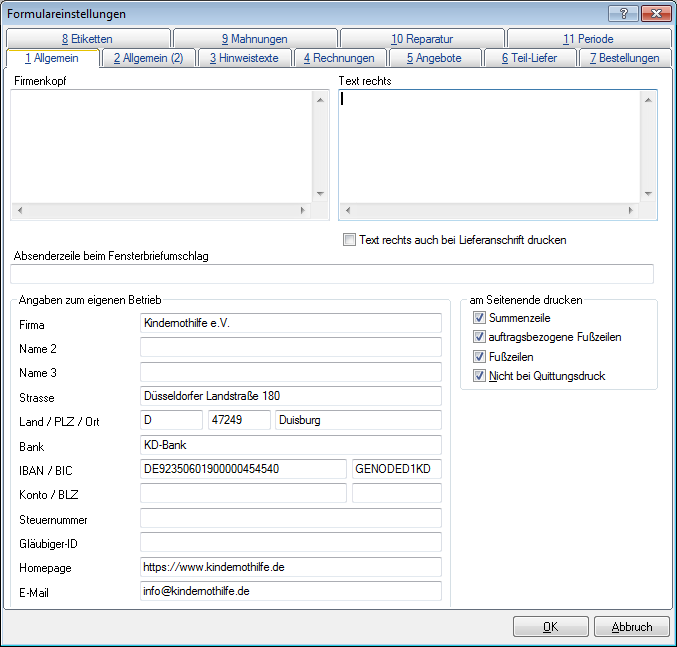 In allen anderen Fällen wird das Konto verwendet, welches Sie in den Formulareinstellungen (Menüpunkt „Menü“ – „Formulareinstellungen“) angeben. Es werden dazu die Angaben „Firma“ für Kontoinhaber und „IBAN“ für die Bankverbindung gewählt. Die BIC wird standardmäßig nicht verwendet.