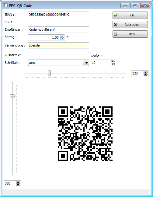 Die Werte in den Feldern IBAN bis Schriftart / Größe werden nicht weiter verwendet, sondern ermöglichen Ihnen, den Barcode vom Bildschirm abzuscannen und damit die Funktionalität zu testen.