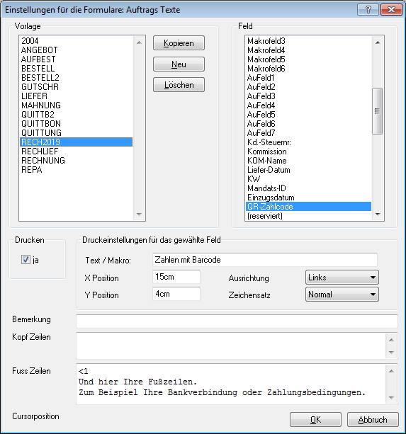 In dieser Maske können Sie nun im Auswahlfeld unter „Formulartexte“ die Vorlage „RECH2019“ auswählen.
