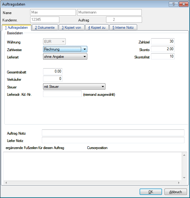 Nachdem alle Vorkehrungen getroffen sind, können Sie jetzt eine Rechnung erstellen, auf dem dieser EPC-QR-Code gedruckt werden soll. Hierbei gilt zu beachten, dass die Warenwirtschaft den Druck dieses Barcodes abhängig macht von der Zahlungsweise. Nur wenn eine Rechnung auch die Zahlweise „Rechnung“ hat, wird der EPC-QR-Code gedruckt. Falls die in der Rechnung verwendete Adresse in den Stammdaten bereits auf Zahlweise „Rechnung“ eingestellt ist, brauchen Sie nichts weiter zu tun. Andernfalls stellen Sie sicher, dass die Zahlweise auf „Rechnung“ steht, indem Sie im geöffneten Auftrag auf den Button „Aufragsdaten“ klicken. Dort sollte bei der Zahlweise die Angabe auf „Rechnung“ stehen.