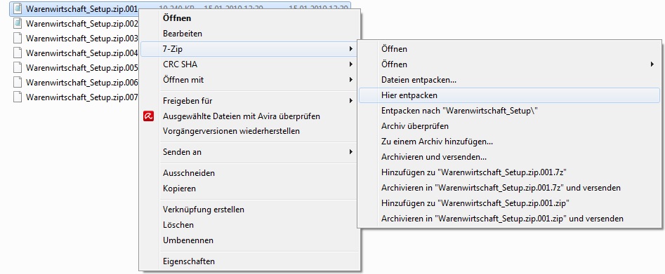 5. Rechtsklicken Sie auf die Datei "Warenwirtschaft_Setup.zip.001", gehen Sie auf 7-Zip und darunter auf "Hier entpacken"