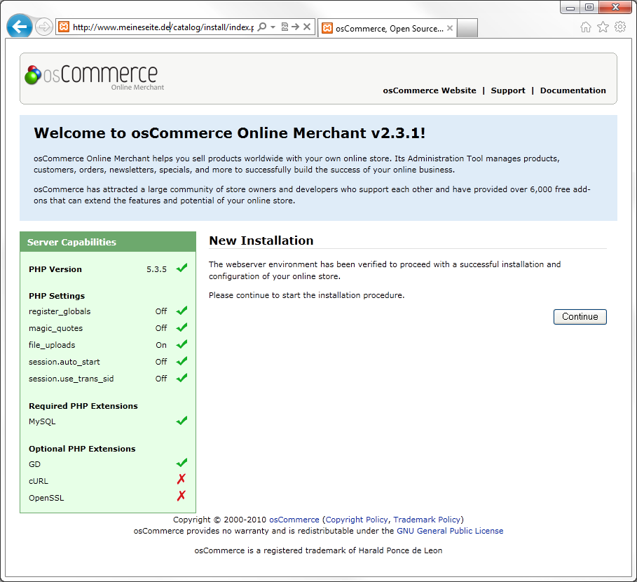 Nachdem der Inhalt des "catalog"-Verzeichnisses auf den Webserver übertragen wurde, wird die eigentliche Installation gestartet. Rufen Sie dazu das zuvor erstellte Verzeichnis auf Ihrer Webseite in einem Browser (Internet Explorer, Opera, Firefox, Chrome etc.) Ihrer Wahl auf.