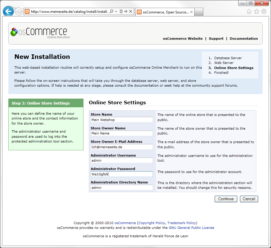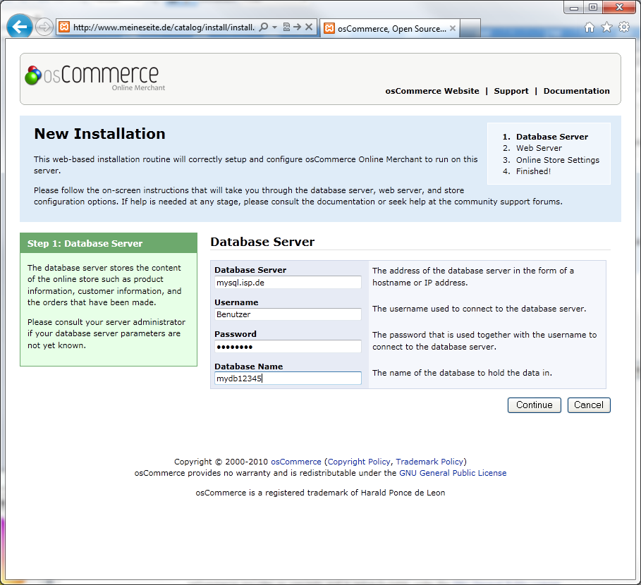 Tragen Sie hier die Zugangsdaten zu Ihrer MySQL-Datenbank ein, wie sie Ihnen von Ihrem ISP übermittelt wurden. Schliessen Sie die Eingabe mit Klick auf [Continue] ab. Sind alle Eingaben korrekt, gelangen Sie zum nächsten Bild; ansonsten erhalten Sie eine Fehlermeldung. Überprüfen Sie in diesem Fall nochmals die eingegebenen Daten.